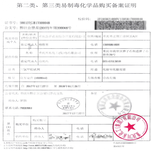 《易制毒化學品購買備案證明》由購買方到當地公安局或者網絡平臺自行辦理。所需銷售方提供的資料向銷售業務員索取。 |